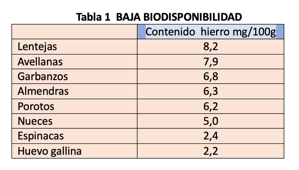 Importa señalar que una cosa es la cantidad de hierro que contiene un alimento y otra cosa es la absorción de este hierro por nuestro organismo. Es lo que conoce como “biosdisponibilidad”.